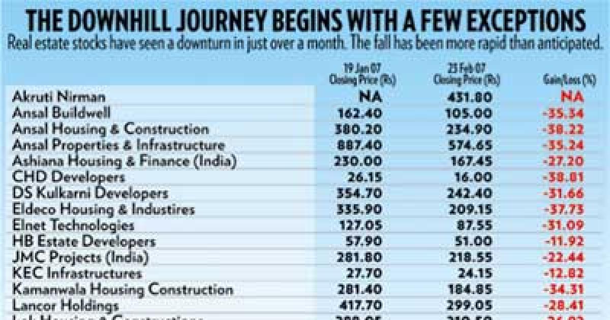 Clearly, investors in such stocks have lost value. For those invested over the medium- or long-term, the loss is notional, after the run-up through all of 2006. But for late entrants, including "successful" IPOs like Parsvanth, the loss is real. We had highlighted the cyclic nature of the sector with a case study of Unitech, a favourite among investors in 2006. We also indicated that if you hold real estate stocks, you have made your money and it's time to quit.