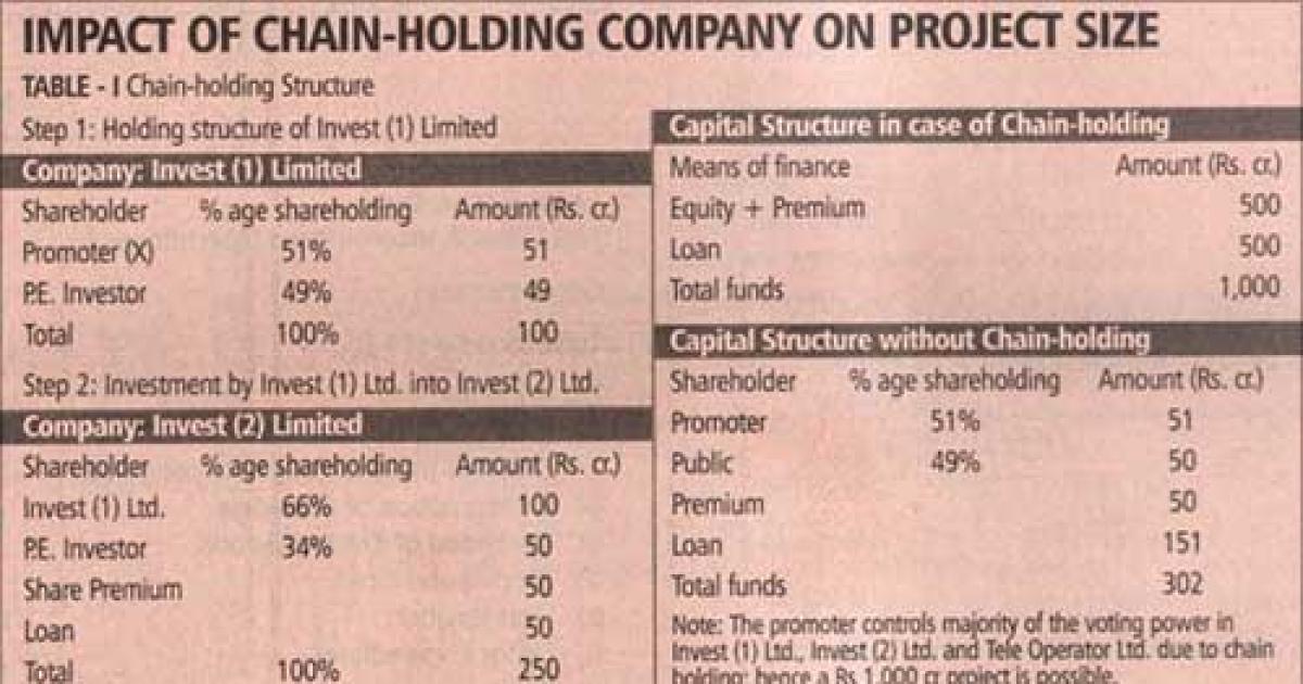 An investor putting in Rs 51 crore (Rs 510 million) is able to leverage equity funds of Rs 500 crore (Rs 5 billion), raise loans of Rs 500 crore and put up a project of Rs 1,000 crore (Rs 10 billion) in a chain-holding structure as against only Rs 302 crore (Rs 3.02 billion) in a directly promoted Tele Operator Ltd.