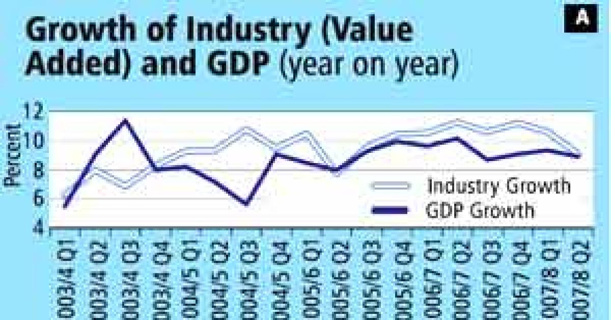 In 2007-08 Q2 the annual rate of industrial value added growth dropped below 10 per cent for the first time in seven quarters. More disconcerting is the steeper decline in the 3-month moving average of growth in the industrial production, down to 8 per cent in October 2007 from the above-12 per cent heights it held for several months.