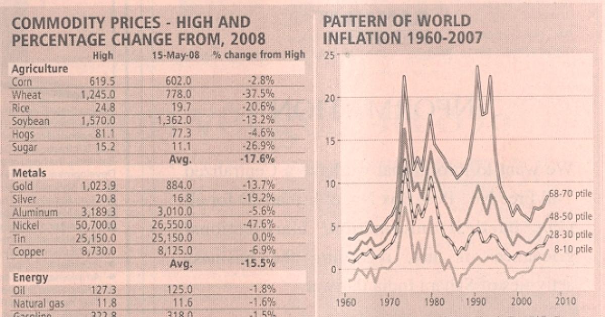 A trough in 1997/98 (Asian crisis), and then a rise such that by late 2007, real commodity prices were on their highs but still considerably below the peak reached in the 1980s. Simultaneously, world per capita growth exceeded 3.5 per cent per annum (purchasing power parity data) during these years - a level not seen since the 1960s. So the pattern, until 2008, has been of high economic growth, high increase in commodity prices and low individual country inflation!