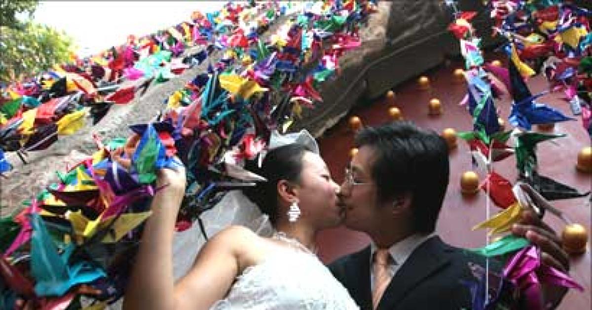 Image: A couple kisses in front of some 770,000 paper cranes decorated on the gate of Zhonghuamen Gate Castle in Nanjing of Jiangsu Province, China.
