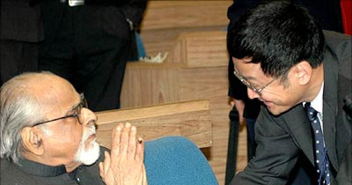 Caption: Former prime minister I K Gujral with hands folded, refuses to shift to front row as a Chinese official pleads with him during a function organised by Indian Council of Cultural Relations in New Delhi on Wednesday.