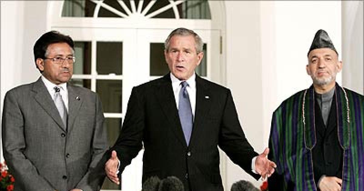 Image: US President George W Bush is flanked by Afghan President Hamid Karzai and Pakistan President Pervez Musharraf ahead of their meeting at the White House.