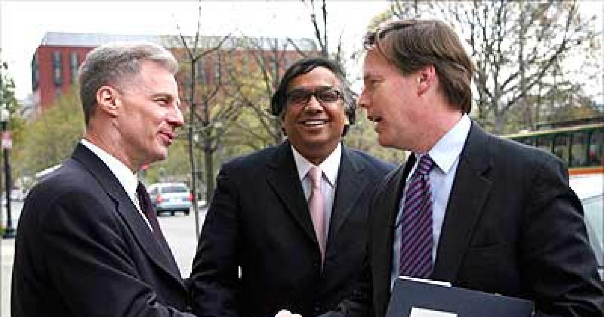 Ron Somers (left), president, US India Business Council greets and receives US Under Secretary of State Nick Burns as community activist Swadesh Chatterjee (centre) looks on. Burns arrived to attend a meeting with the Commercial Nuclear Executive Committee, hosted by the USIBC in Washington DC on April 17. The event was part of on going Indo-US Nuclear Initiative programme.