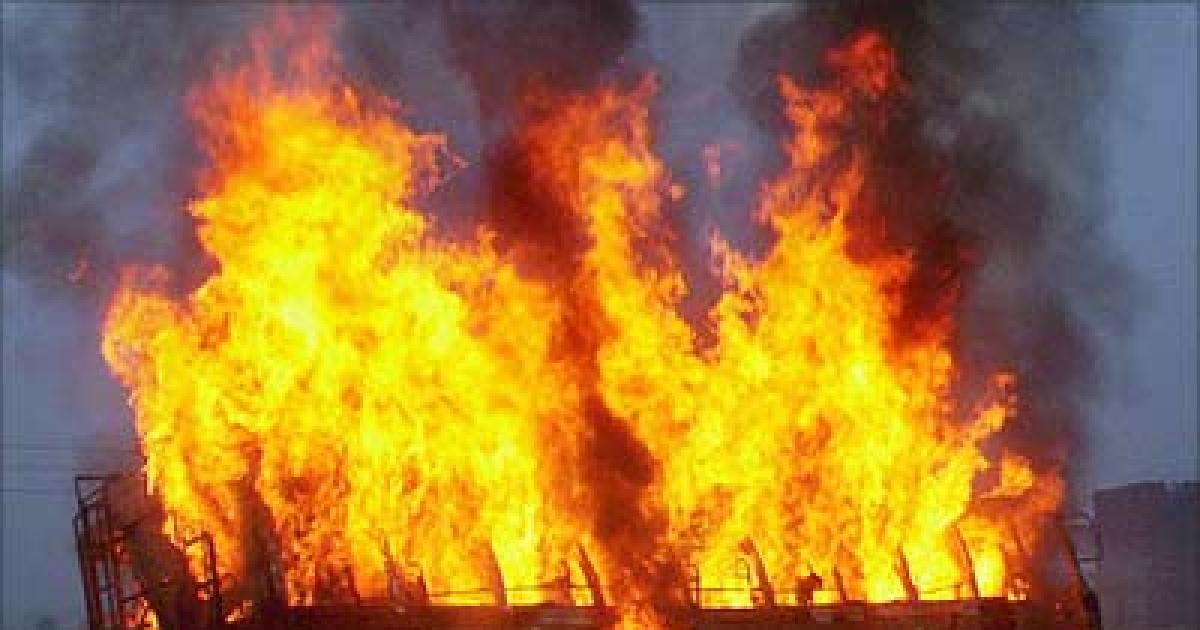 Image: The bus ablaze on National Highway No. 2 at Rupakpur in Firozabad on Tuesday.