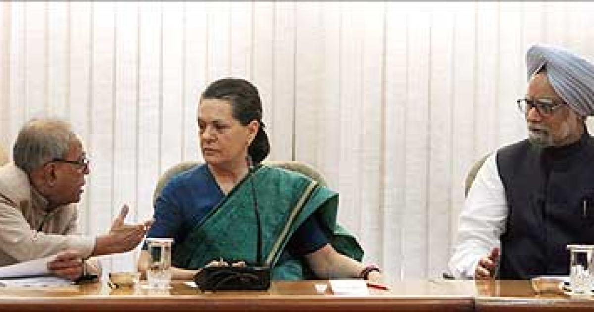 Image: External Affairs Minister Pranab Mukherjee discusses a point with Congress president Sonia Gandhi at her residence on Friday morning, during a meeting of the United Progressive Alliance's allies. Prime Minister Manmohan Singh looks on.
