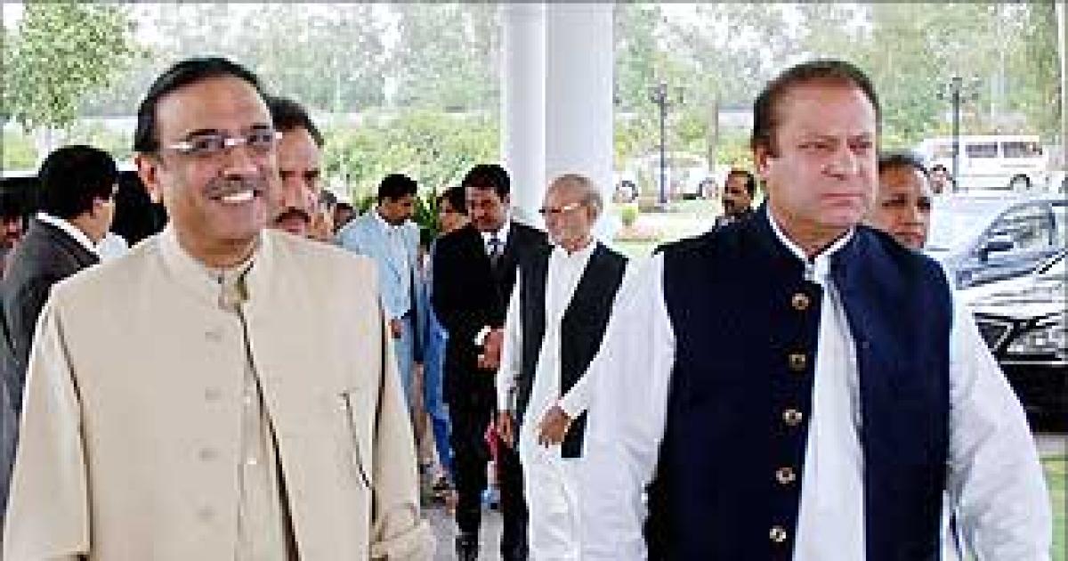 Image: Asif Ali Zardari, co-chairman of the Pakistan People's Party, walks with former premier Nawaz Sharif (right) ahead of the meeting at the latter's residence in Lahore on June 18.