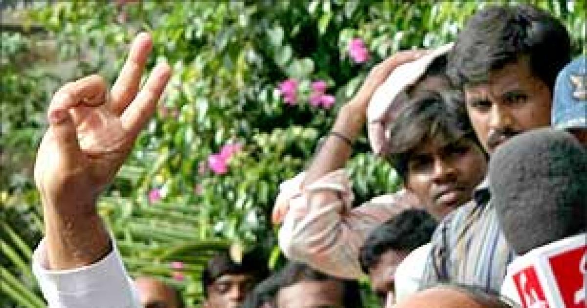 Image: Devender Goud waves to supporters after resigning from the party at his residence. A large number of people gathered at Goud's palatial residence in posh Banjara Hills area, bursting crackers, raising slogans and singing songs to hail him for his "brave and bold" move. Photograph: Snaps India