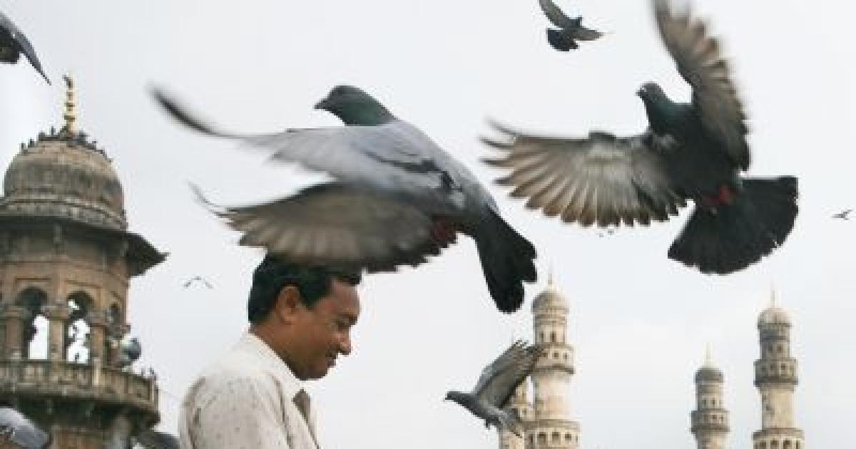 Image: A man feeds pigeons inside premises of the famous Mecca Masjid, beside the Charminar in Hyderabad.