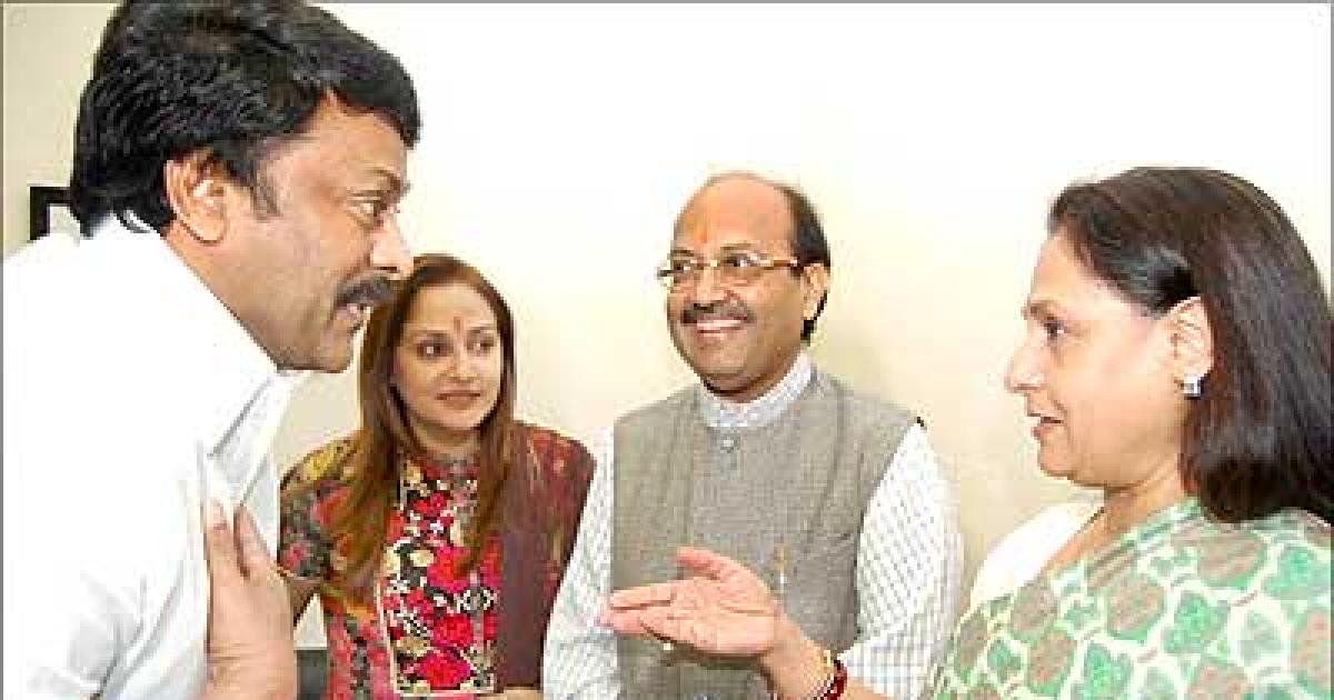 The Samajwadi party general secretary Amar Singh along with two actresses-MPs Jaya Prada and Jaya Bachchan came to the office of the Telugu megastar-turned politician Chiranjeevi in Hyderabad on Sunday evening, spent close to one hour and went back leaving a lot of questions unanswered. Though Amar Singh left no stone unturned to give the impression that the meeting was a courtesy call by friends and well wishers to congratulate Chiranjeevi on his entry in to politics, the lingering feeling in the political circles was that there was more to the meeting than meets the eye.