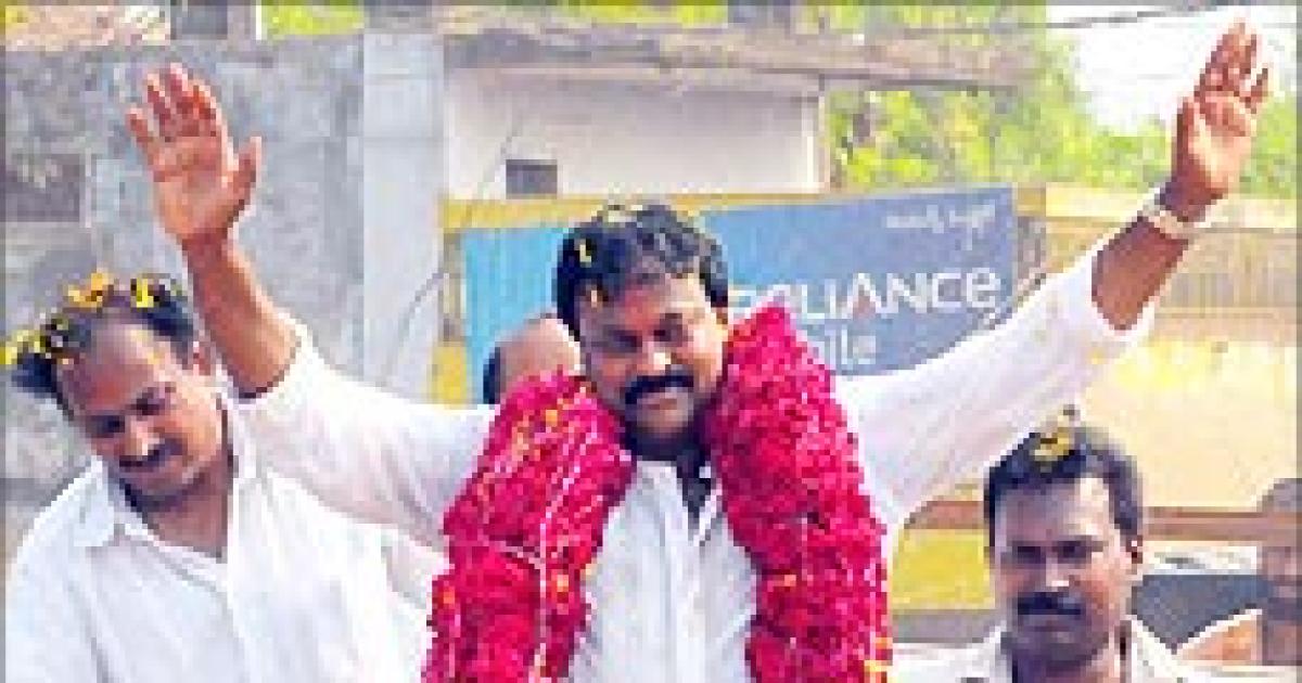 Image: (Above) Praja Rajyam Party chief Chiranjeevi on a roadshow at Guntur district. (Below) Telugu film star & Chiranjeevi's son Ramcharan Teja at the Pepsi event in Hyderabad.