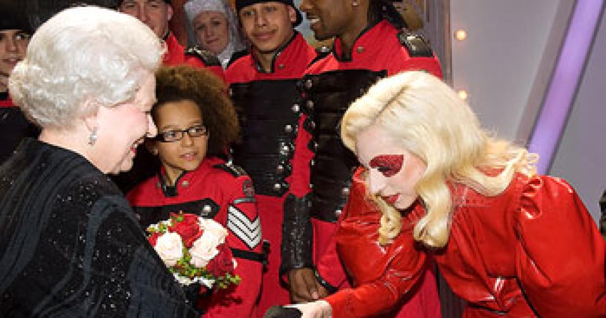 The Poker Face hitmaker, wearing a red PVC outfit, which featured a 20ft long cloak and Elizabethan-style collar, seemed to have toned down her outrageous style for Queen Elizabeth II.