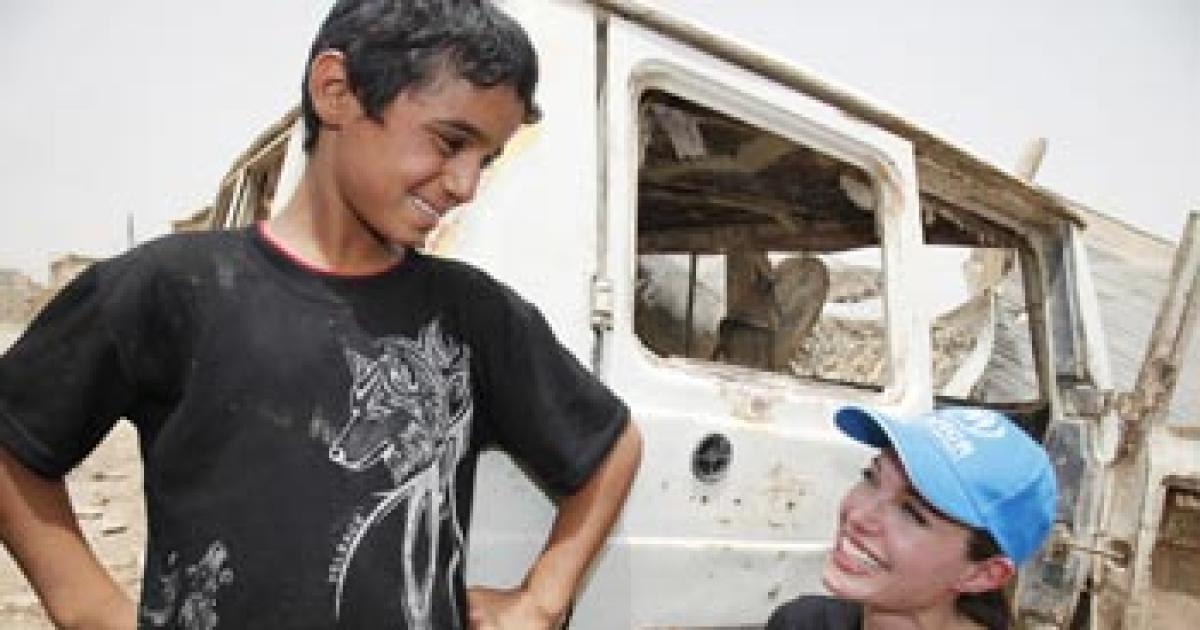Image: Angelina Jolie laughs with an internally displaced boy at a makeshift camp northwest of Baghdad.