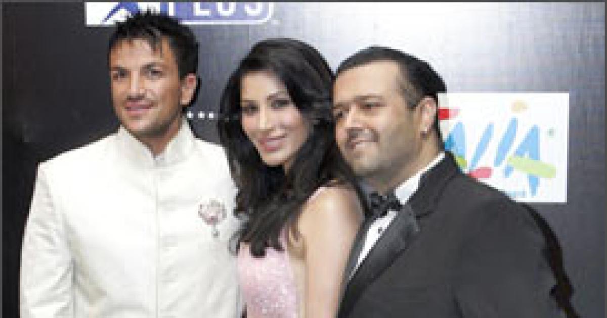 Image: Peter Andre (left) poses with Sophie Chaudhary and an unidentified guest at the 10th International Indian Film Academy (IIFA) awards in Macau, China.