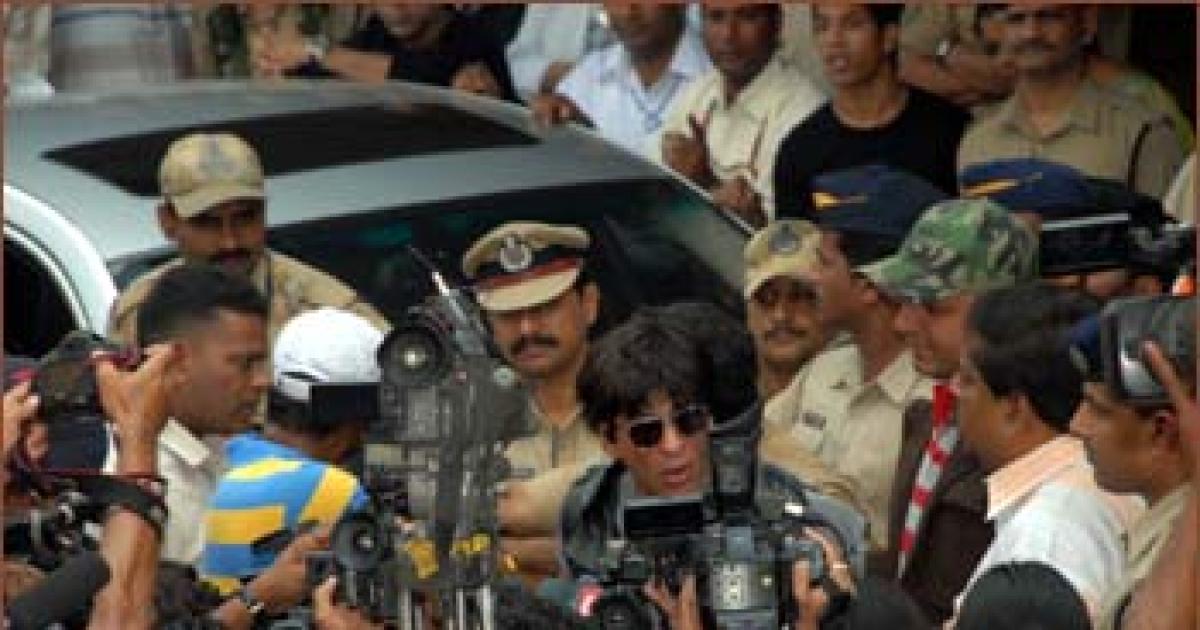 In the picture: Mediapersons and police personnel gather around Shah Rukh Khan at the airport. Photograph: Pradeep Bandekar