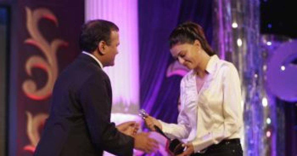 Image: Sushmita Sen recieves the award from industrialist Pradeep Dhoot