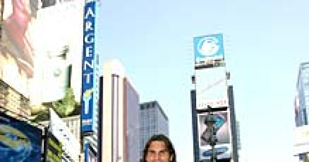U.S. Open champion Roger Federer breezed into New York's Hard Rock cafe on Monday clutching his latest piece of silverware.