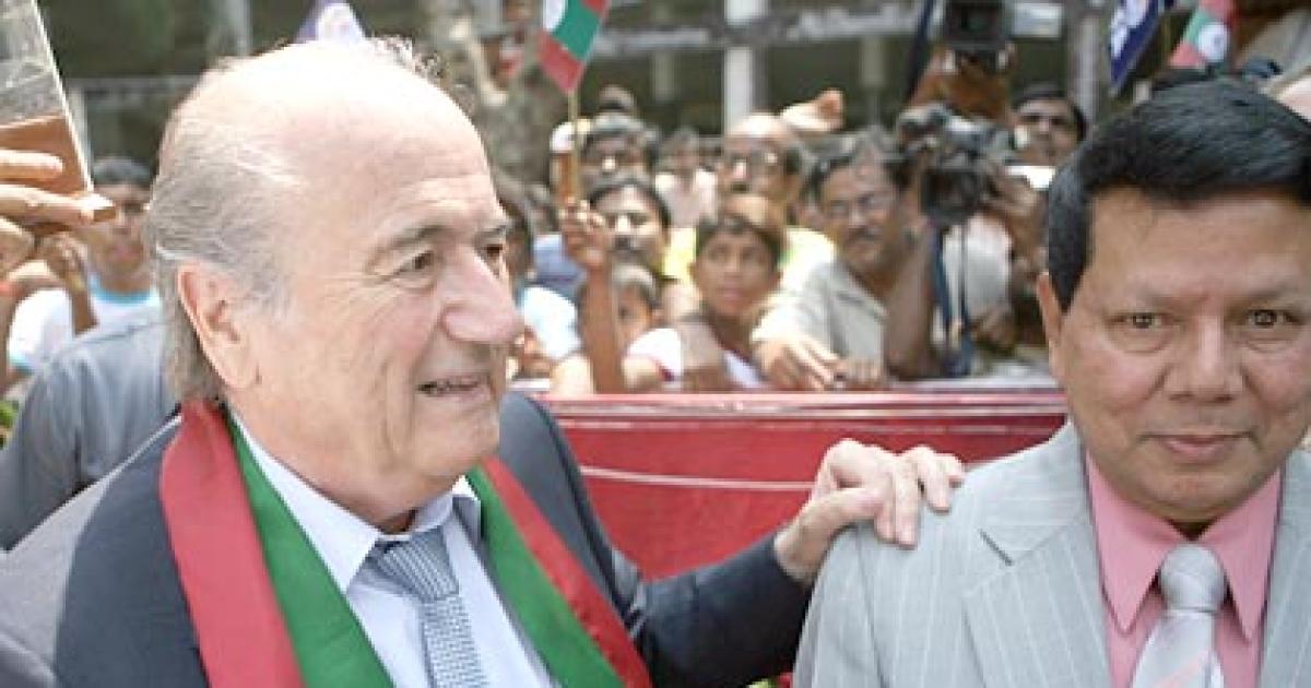 Image: FIFA President Joseph Sepp Blatter (left) walks with Indian Football Association President Priyaranjan DasMunshi during a visit to Mohun Bagan Football Club in Kolkata on Sunday.