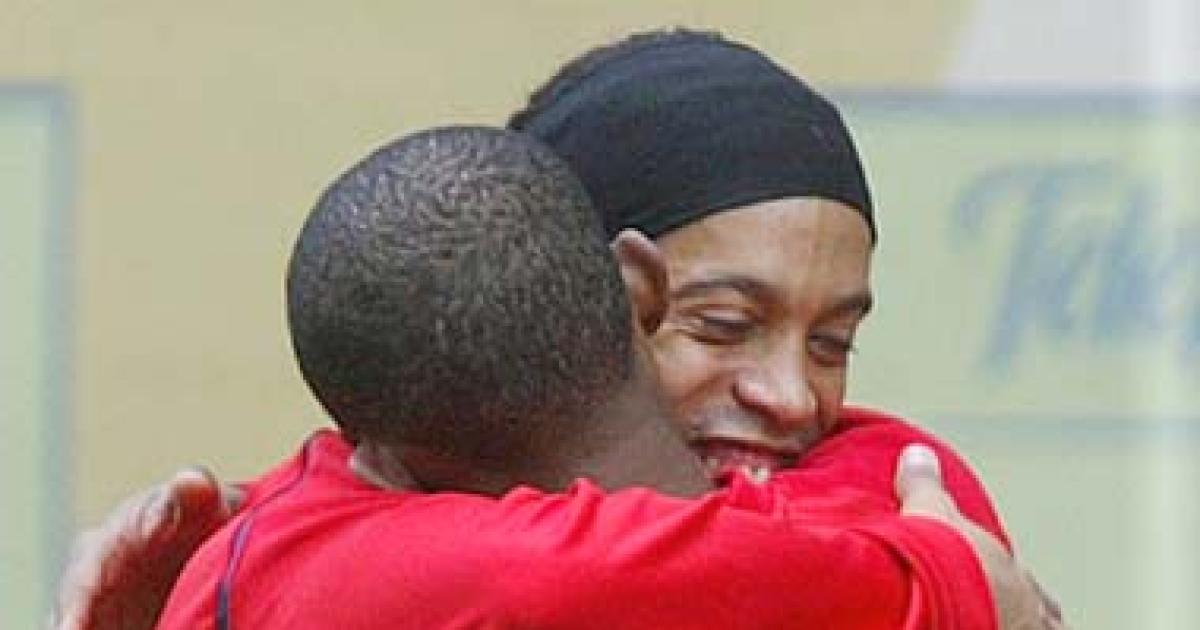 Samuel Eto'o and Ronaldinho made a public display of reconciliation by embracing as Barcelona tried on Wednesday to heal the rifts caused by the Cameroon striker's recent outburst.