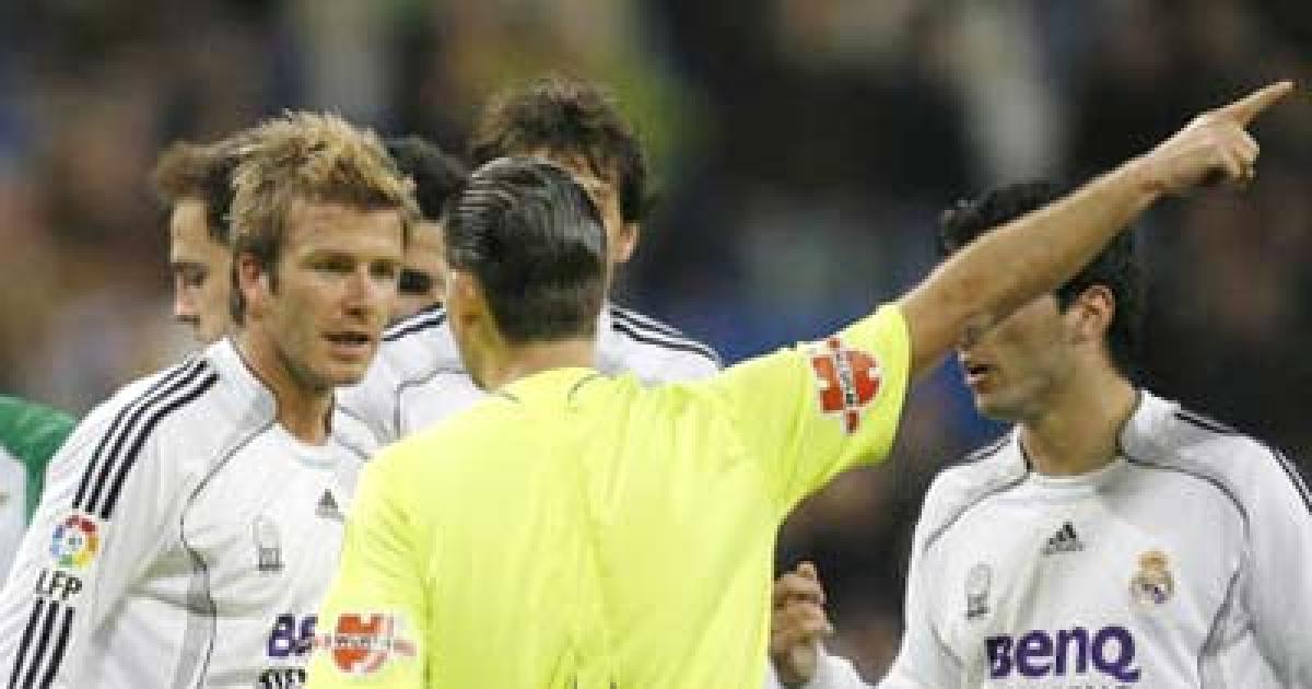 David Beckham was sent off in the final minute of Real Madrid's 0-0 home draw with lowly Real Betis in the Primera Liga on Saturday.