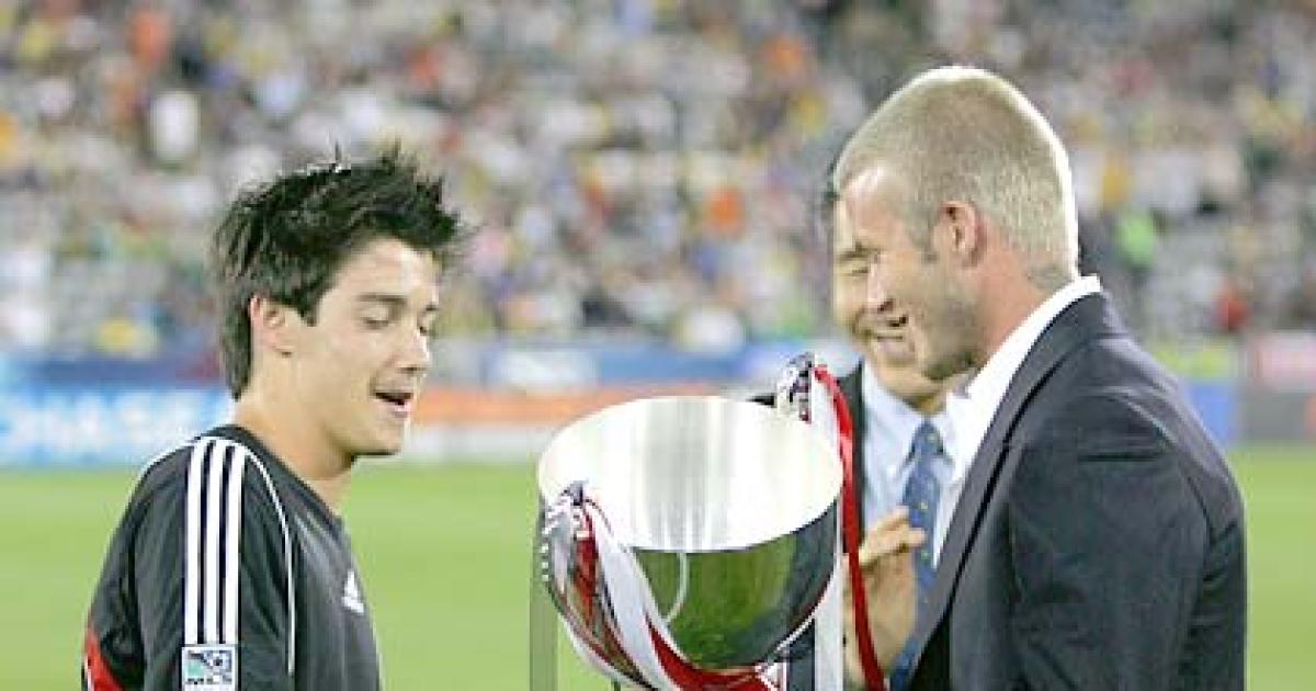 Image: David Beckham presents the U-17 MLS Youth Cup trophy to D.C. United captain Chris Jumalon during half time at the MLS All-Star game against Celtic FC on Thursday. Photograph: Doug Pensinger/Getty Images