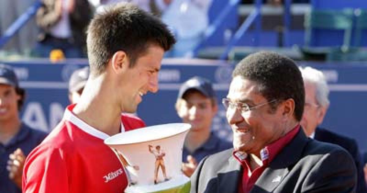 Pic: Djokovic receives the trophy from Portugal football great Eusebio/Getty Images.