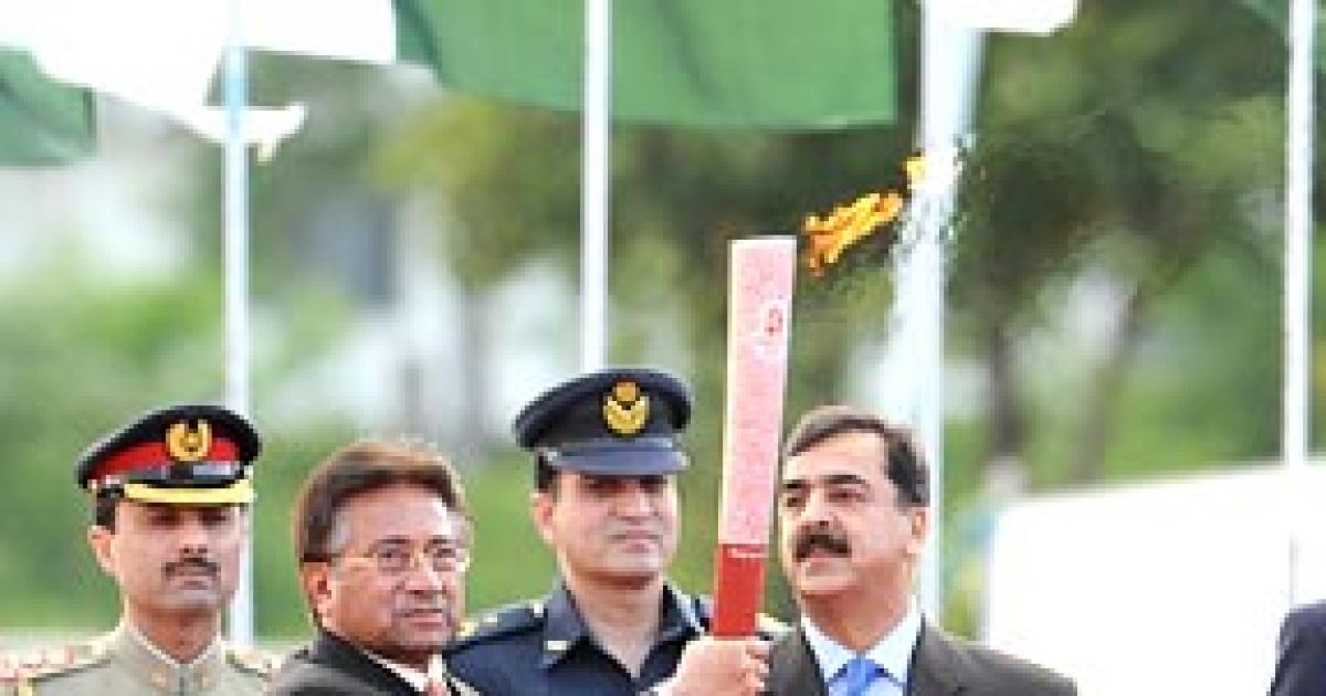 After being taken around the stadium by volunteers, the lantern was used to light the torch, which was then handed over to Musharraf and Gillani, who participated in the event together keeping aside their political differences.