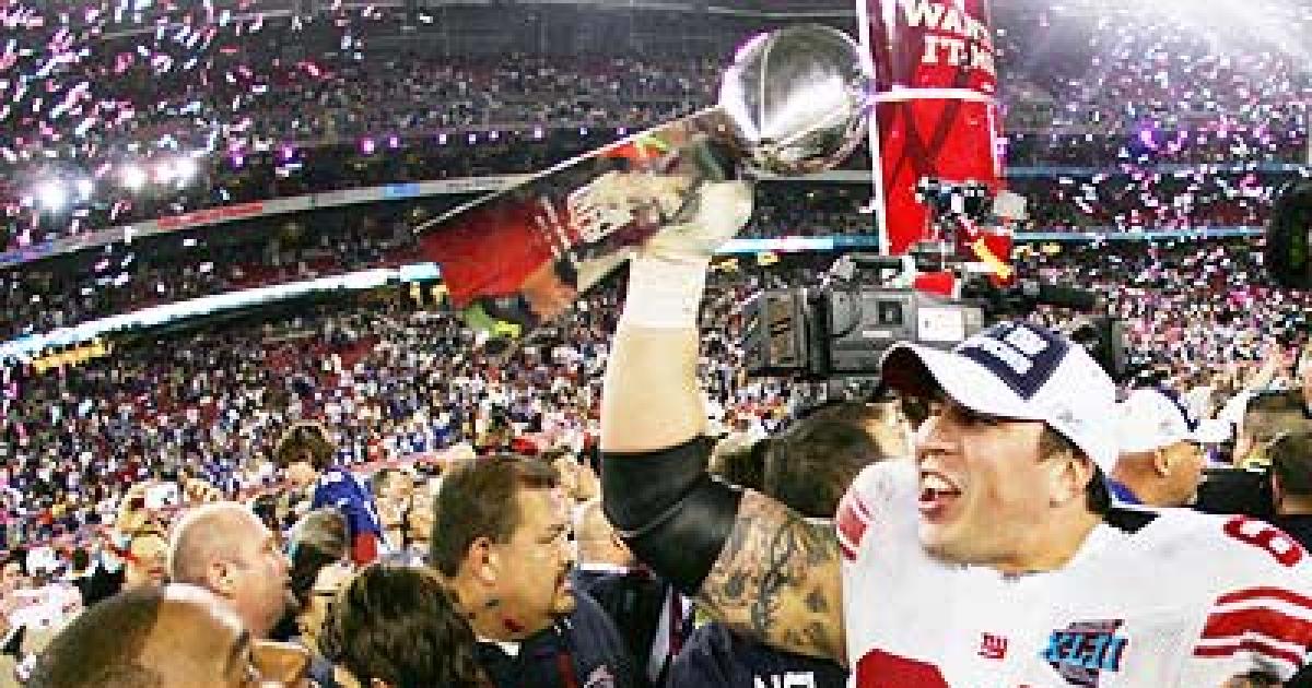 Image: David Diehl #66 and Osi Umenyiora #72 of the New York Giants celebrate with the Vince Lombardi Trophy after beating New England Patriots 17-14 in Super Bowl XLII at the University of Phoenix Stadium in Glendale, Arizona, on Sunday