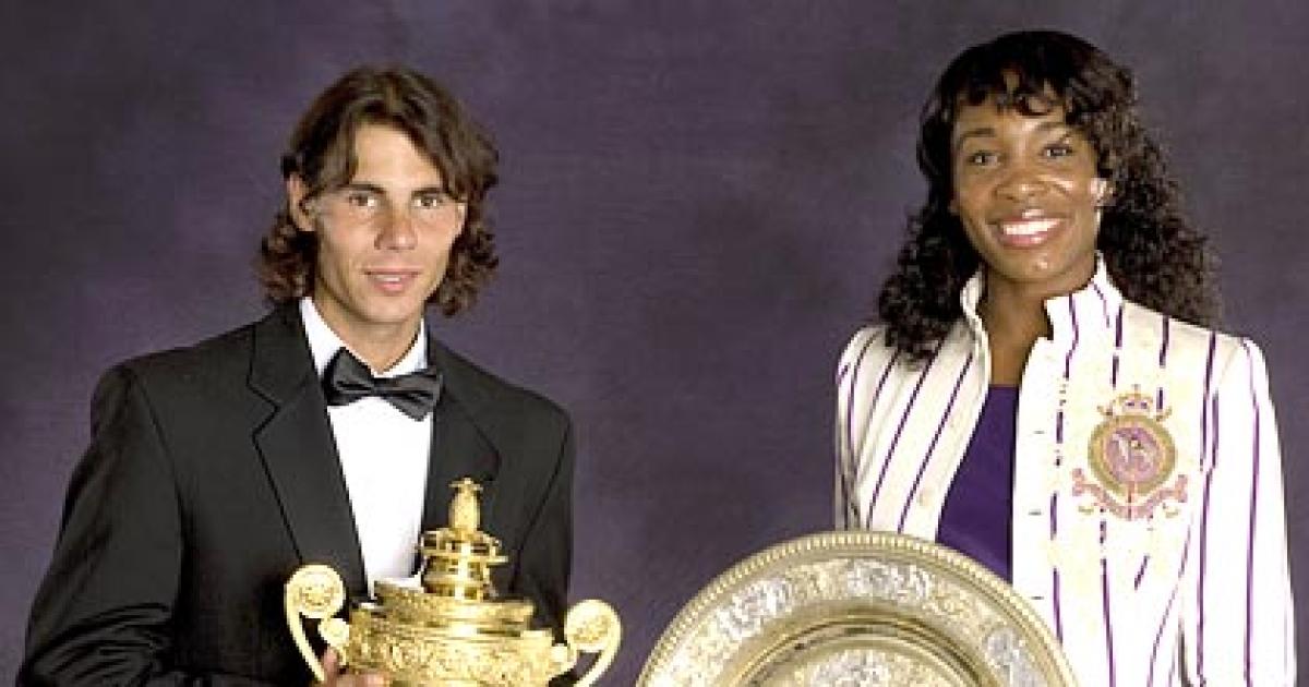 Spaniard Rafael Nadal, the Gentleman's Singles title winner and American Venus Williams, the Ladies' Singles champion, pose with their trophies at the Champions Dinner held at the Hotel Intercontinental Park Lane in London on Monday.