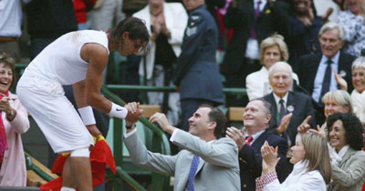 Rafael Nadal is congratulated by Crown Prince Felipe of Spain and Princess Letizia after he beat Roger Federer in an epic final at Wimbledon on Sunday to win his first title at the grass-court Grand Slam.