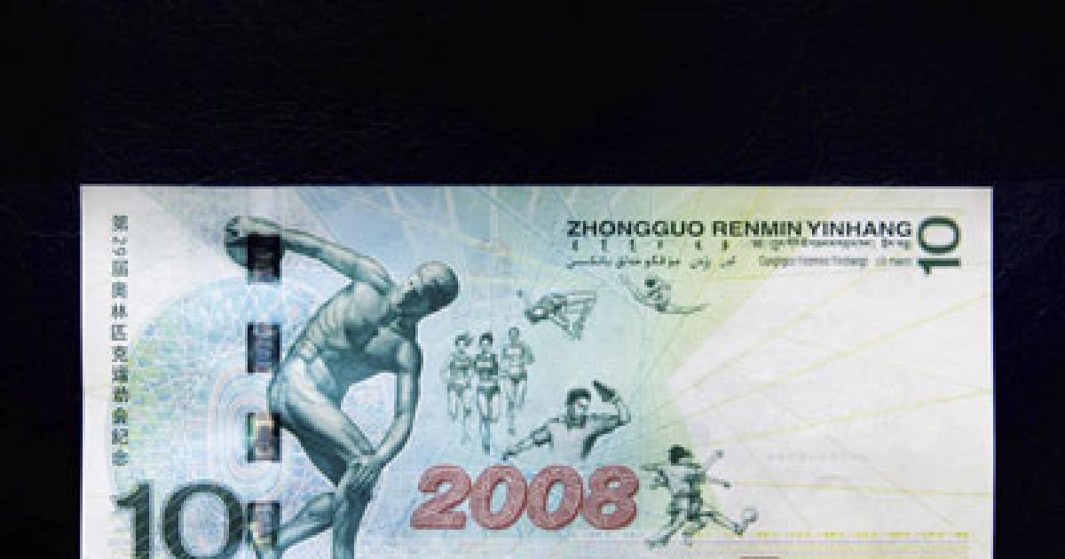 One side of the new cyan-coloured note features the National Stadium, or Bird's Nest, in north Beijing, the main venue for the Aug. 8-24 Games.