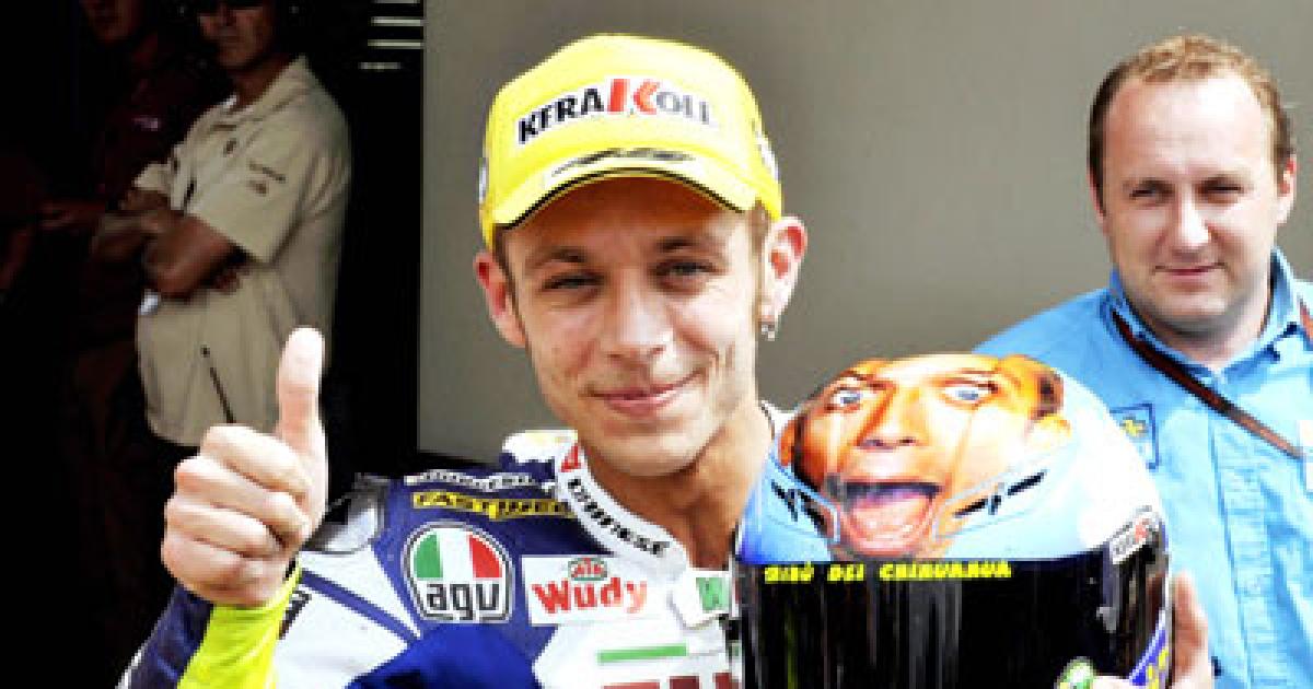 The five-times premium class world champion, donning a fancy helmet with his own face on top, never let it go and finished over two seconds ahead of Australian world champion Casey Stoner on a Ducati.