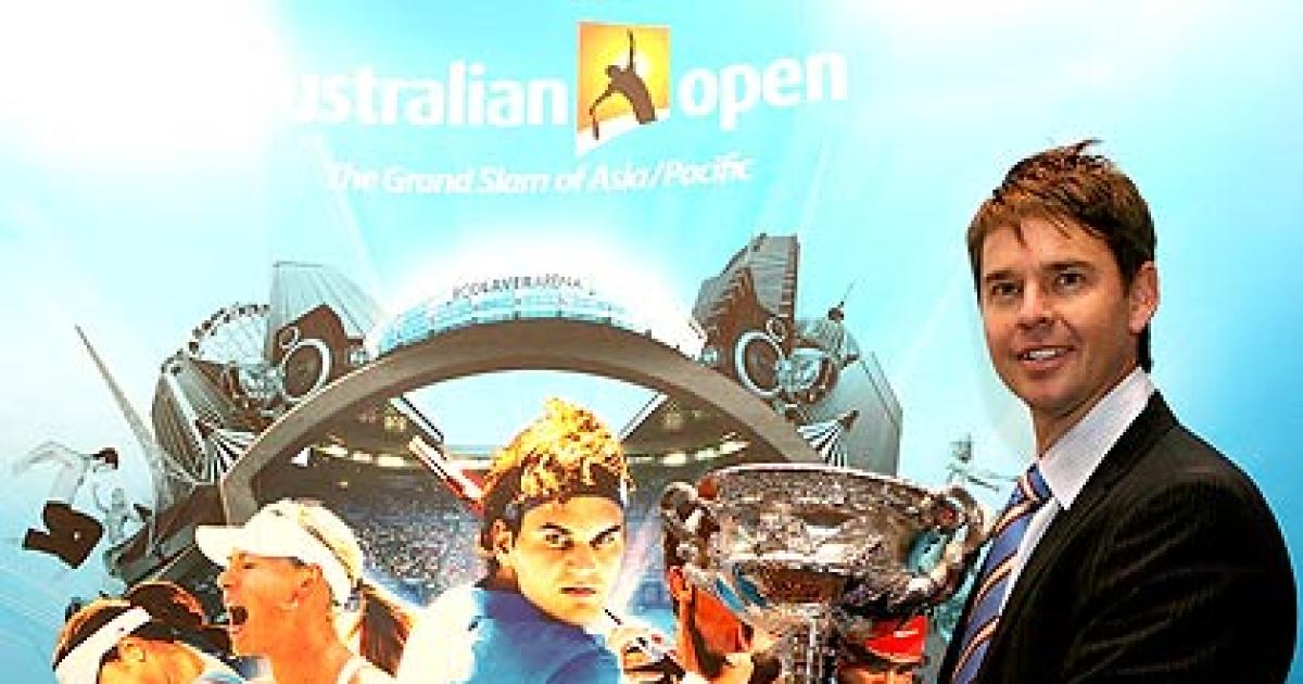 Photograph: Former doubles champion Todd Woodbridge holds the men's singles trophy during the offical launch of the 2009 Australian Open at Rivoli Cinemas on October 8, 2008 in Melbourne, Australia. (Photo by Robert Prezioso/Getty Images)