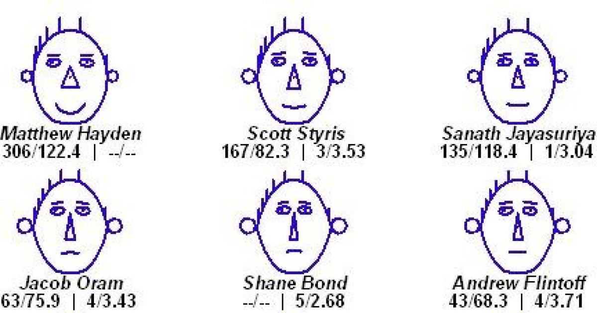 As always, pure batsmen have rounded, smiling faces with wide noses, batting all-rounders have rounded faces with a taller nose and bigger ears, and bowlers have tapered faces with tall, thin noses and big ears.